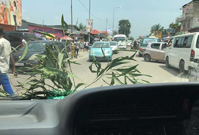 下の写真は、私が2月3日にキンシャサで、タクシーの中から撮影したものです。窓のところに葉っぱが飾られていますが、チセケディ氏に哀悼の意を表しています。キンシャサでは、数日間、この飾りをした車をしばしば目にすることになりました。